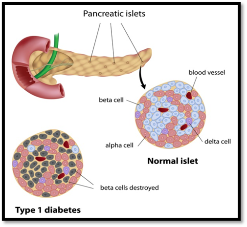 Figure no 2: Structural comparison of normal pancreatic islets and Type 1 diabetes, showing selective destruction of insulin-producing beta cells within the islets of Langerhans.