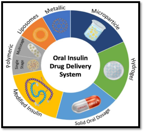 Oral insulin delivery represents a major advancement in diabetes management, offering a non-invasive alternative to subcutaneous injections. Conventional insulin is poorly absorbed in the gastrointestinal tract due to enzymatic degradation and low permeability across the intestinal epithelium. Novel drug delivery strategies have been developed to overcome these barriers, including nanoparticle-based carriers, liposomes, polymeric micelles, and mucoadhesive systems. (21)