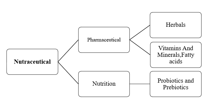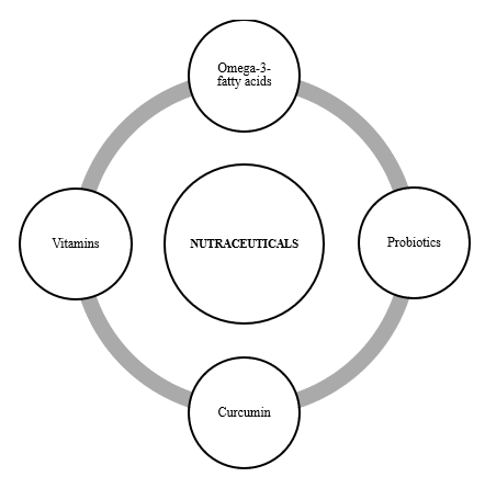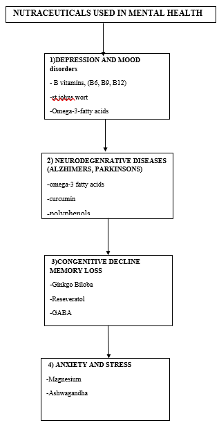 Nutraceuticals is the term that combines “nutrition” & “pharmaceutics.” These products are derived from natural sources, including herbal extracts, dietary supplements, specific regimens, soups, and beverages that serve medicinal purposes in addition to their nutritional value. These formulations are specifically designed to address particularly dietary requirements and offer preventing health benefits. These preparations combine nutrients to prevent and treat various diseases, complementing a balanced diet. Dr. Stephen De Felice is credited with creating the term nutraceuticals in 1989 merging 'nutrition' & 'pharmaceutical.' Nutraceuticals encompass food products or components that offer numerous health benefits, including disease prevention and treatment. The field of nutrition has expanded significantly, shifting from addressing nutrient deficiencies to focusing on human health, to prevention of chronic diseases and treatment. The concepts of nutraceuticals, food supplements, and dietary supplements have evolved from Dr. De Felice's pioneering work. A dietary supplement is defined as a product that contains at least one of the following ingredients: minerals, vitamins, amino acids, botanicals, or other substances intended to enhance the diet. These supplements can take various forms, including concentrates, extracts. They a subset of dietary supplements, serve purposes beyond basic nutrition, providing specific health benefits and promoting overall wellbeing. Nutraceuticals are currently gaining wide popularity in treatment of multiple disorders. Nutraceuticals are different from dietary supplements because in addition to nutritional supplementations of diet, they alsoaid in the prevention and treatment. Nutraceuticals, which are food components with potential health benefits, are increasingly recognized in the field of mental health. This growing interest is driven by accumulating evidence indicating that adequate nutrition can profoundly influence mental well-being. Nutraceuticals may serve as alternative or supplementary treatment options to conventinal medications by targeting fundamental biological processes associated with inflammation, oxidative stress,and neurotransmitter equilibrium. Potential Benefits: Studies indicate that certain nutraceuicals like omega-3 faty acids, vitamin D,B vitamins, and probiotics may help alleviate synptoms of depression, anxiety, bipolar disorder, and cognitive decline by influencing neurotransmitter balance, inflammation, and gut health, which are all interconnected with brain function. A review article on nutraceuticals and mental health explores the relationship between diet, bioactive compounds , and pghysiological well being.Role of nutraceuticals in managing depression, anxiety, conginitive decline, stress, and neurodegenerative diseases.(eg. Alzheimers, Parkinsons). [1,3,8,9]