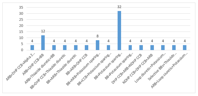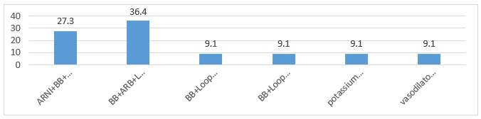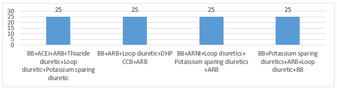 In subjects prescribed with quadruple therapy a combination of BB+ ARB+ loop diuretics+ potassium sparing diuretics was commonly prescribed with percentage of 36.4 followed by others.