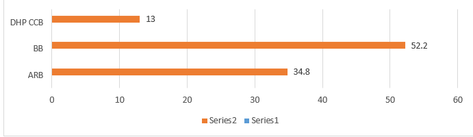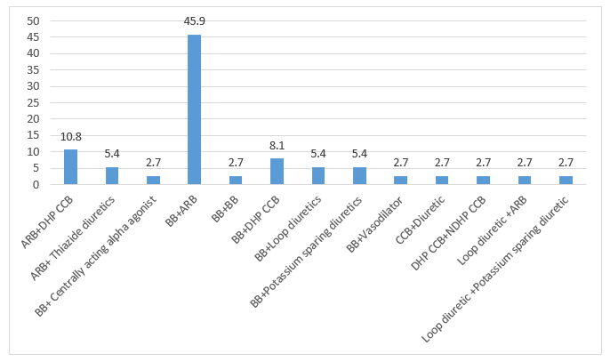 In subjects prescribed with dual therapy, a combination of BB and ARB was found to be predominantly prescribed i.e 45.9% followed by combination of ARB+ dhp CCB and BB+dhp CCB i.e 10.8 and 8.1 followed by others.