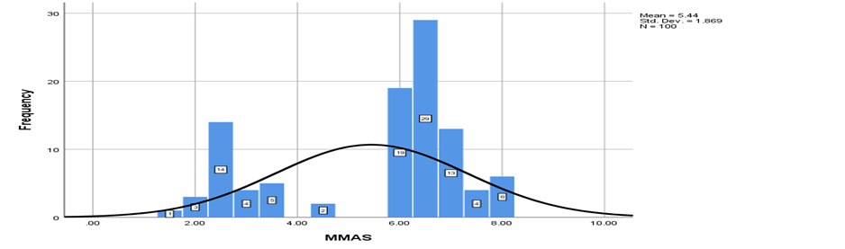Among 100 subjects enrolled into the study, 65% of subjects were moderately adherent to the prescription and only 6% being highly adherent, with mean MMAS scoring 5.4425.
