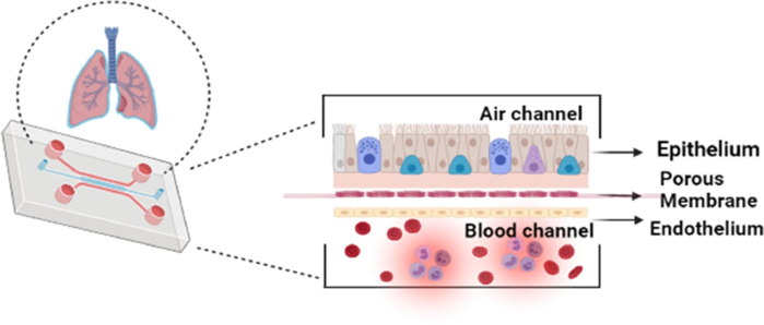 The lung-on-chip model is one of the earliest and most widely studied organ-on-chip systems. It was designed to replicate the alveolar–capillary interface of the human lung, where gas exchange occurs between air and blood. Typically, this device consists of two microfluidic channels separated by a flexible porous membrane. Human alveolar epithelial cells are cultured on one side of the membrane, while vascular endothelial cells are grown on the opposite side to simulate the air–blood barrier present in the lungs.[1,14]