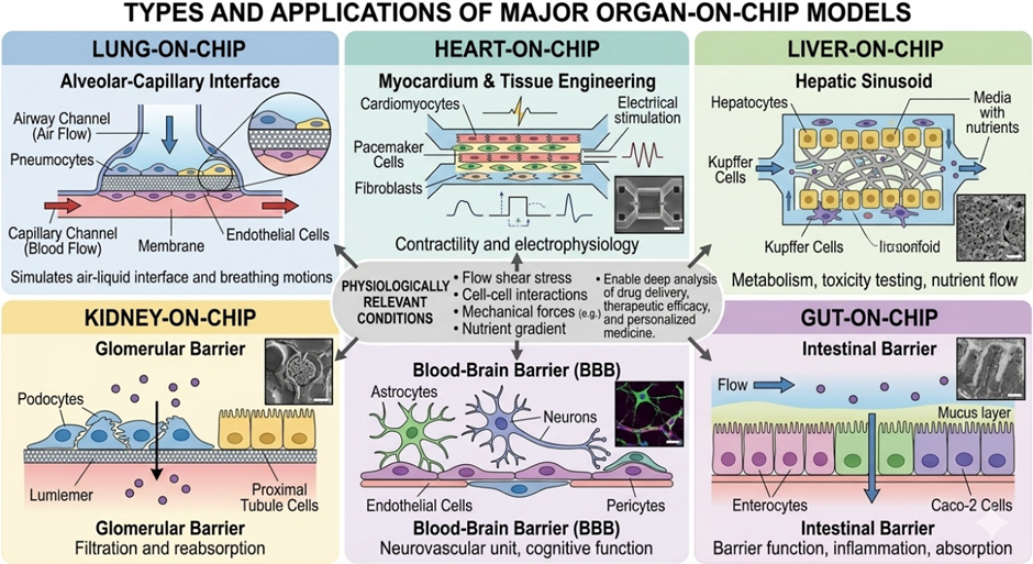 Organ-on-chip technology has enabled the development of a wide range of micro engineered platforms that replicate the structural and functional characteristics of individual human organs. These devices are designed to recreate the physiological microenvironment of specific tissues by integrating living cells, microfluidic channels and mechanical stimuli within a controlled microfabricated system. By mimicking essential organ-level functions, organ-on-chip platforms provide valuable tools for studying disease mechanisms, drug metabolism and toxicity responses in vitro. Over the past decade, numerous organ-specific models have been developed, including lung-on-chip, liver-on-chip, heart-on-chip, kidney-on-chip, brain-on-chip and gut-on-chip systems, each designed to reproduce unique biological functions of the respective organ.[4,12]
