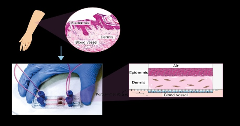 Figure 3: Skin-on-chip model illustrating the reconstruction of epidermal and dermal layers within a microfluidic device that mimics the physiological microenvironment of human skin for drug testing and dermatological research.