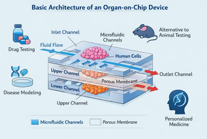 Organ-on-chip devices are designed to mimic the structural and functional characteristics of specific human organs by combining principles of tissue engineering, microfluidics and cell biology. By reproducing organ-like microenvironments, these platforms enable more accurate investigation of drug metabolism, toxicity and disease mechanisms compared with traditional in vitro models. Consequently, organ-on-chip technology has emerged as a powerful tool for improving drug screening, reducing reliance on animal experimentation and enhancing the predictive capability of preclinical studies in pharmaceutical research.[1,2]