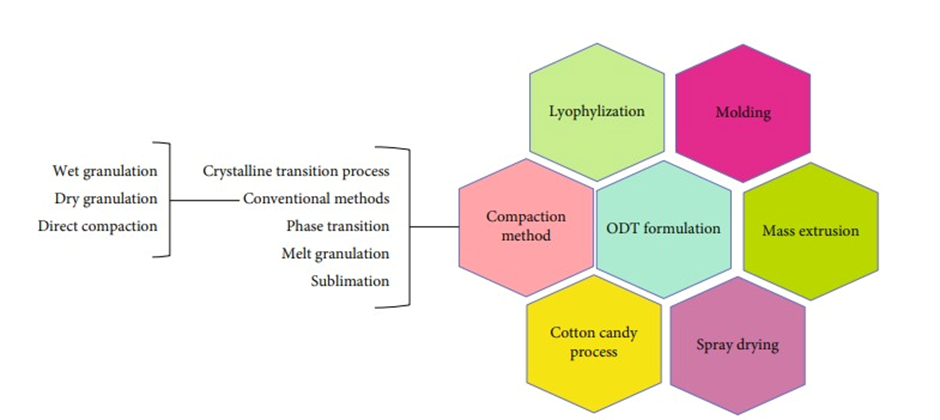 This review article summarizes the commonly used methods for preparing ODTs, including moulding, direct compression mass extrusion, spray-drying, sublimation, and lyophilization (freeze-drying).