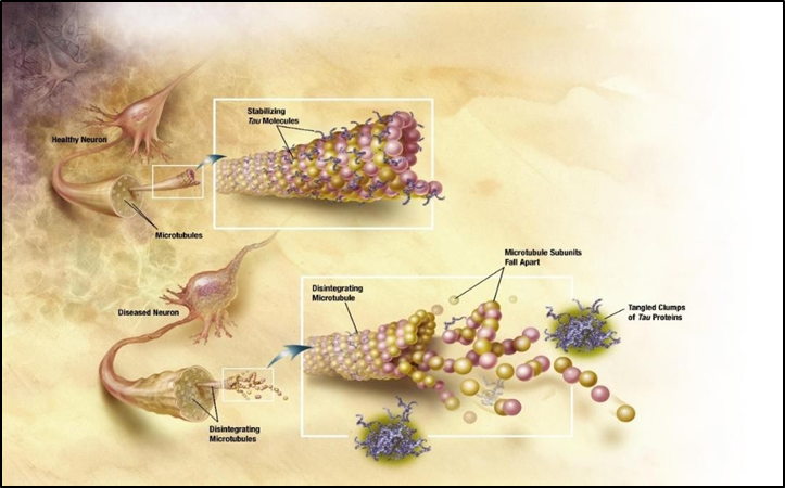 Neurofibrillary Tangles: Tau proteins inside neurons twist abnormally into tangles that impair the movement of nutrients and other necessary components within the cells, ultimately resulting in neuronal death.