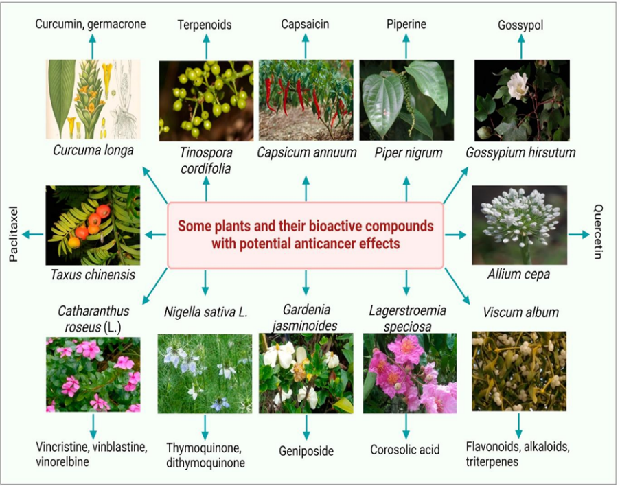 Medicinal plants contain many natural chemicals, known as bioactive compounds, which have various health benefits, including anti-cancer effects. These compounds mainly belong to four groups: flavonoids, alkaloids, terpenoids, and polyphenols. Flavonoids are plant nutrients found in almost all fruits and vegetables. They act as antioxidants, which means they protect cells from damage caused by free radicals. Some flavonoids can slow down the growth of cancer cells and reduce inflammation, making them useful for cancer prevention and treatment. Alkaloids are another important group of compounds that contain nitrogen. They show many medicinal activities, such as pain relief, anti-malarial effects, and anti-cancer properties. Well-known anticancer medicines like vincristine and vinblastine, which come from the Madagascar periwinkle plant, are examples of powerful alkaloids used in cancer therapy. Terpenoids (or isoprenoids) are the largest class of plant compounds. They help plants grow and have several medicinal uses. A famous terpenoid is taxol, taken from the Pacific yew tree, which is widely used in chemotherapy because it stops cancer cells from dividing. Polyphenols are compounds with multiple phenol groups and are known for their strong antioxidant and anti- inflammatory effects. Resveratrol, a polyphenol found in grapes and red wine, has been researched for its ability to prevent and fight cancer by influencing cell growth and triggering apoptosis (cell death). In short, the bioactive compounds found in medicinal plants—flavonoids, alkaloids, terpenoids, polyphenols—offer valuable properties that may help in cancer prevention and treatment. Ongoing studies continue to reveal their full potential and may lead to the creation of new and effective cancer therapies.