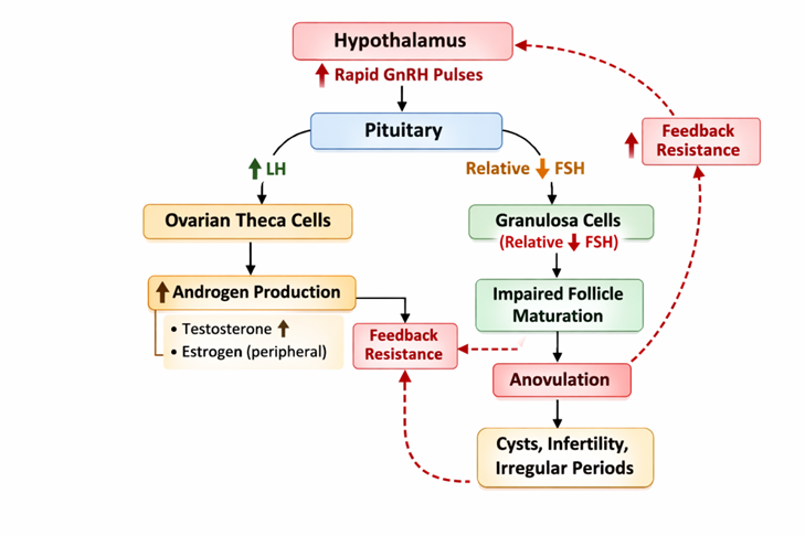 This altered pulsatility of gonadotropin-releasing hormone favors LH synthesis over FSH, disrupting the hormonal environment required for ovulation (Rosenfield & Ehrmann, 2016).