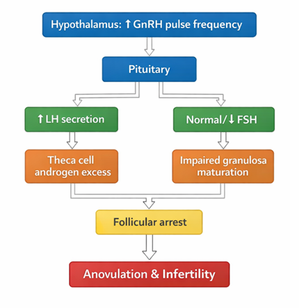 PCOS is a multifactorial disorder characterized by intertwined endocrine, metabolic, and neuroendocrine abnormalities. Hyperandrogenism, insulin resistance, chronic inflammation, and altered GnRH pulsatility collectively impair folliculogenesis and ovulation, resulting in infertility. Systemic complications extend beyond reproduction, affecting cardiometabolic and psychological health.