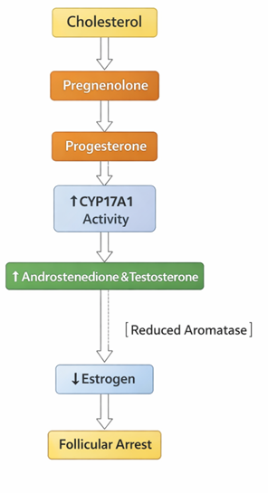The ovarian steroidogenic pathway is dysregulated in PCOS, particularly at the level of 17α-hydroxylase/17,20-lyase (CYP17A1). Increased enzymatic activity shifts steroid production toward androgen synthesis rather than estrogen formation (Diamanti-Kandarakis & Dunaif, 2012).