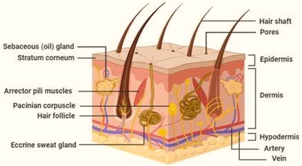 One potential obstacle to transdermal medication administration is the skin. Conversely, its capacity to restore itself and provide protection might make it highly esteemed. An adult's skin prevents water loss and shields us from unwanted environmental stimuli. It covers approximately two m2 of the body [3]. In Figure 1, we can see a simplified skin diagram.