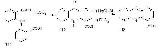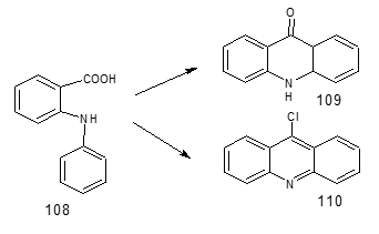Synthesis of six membered rings Rutacea family plants possess Acridine alkaloids derived from anthranilic acid [107]. The extraction, isolation, characterisation and synthesis of alkaloids are periodically reviewed [108]. There are enormous syntheses of acridones and acridines from N-aryl anthranilic acid in the literature. The two main schemes given in Figure 34. Acridone (109).
