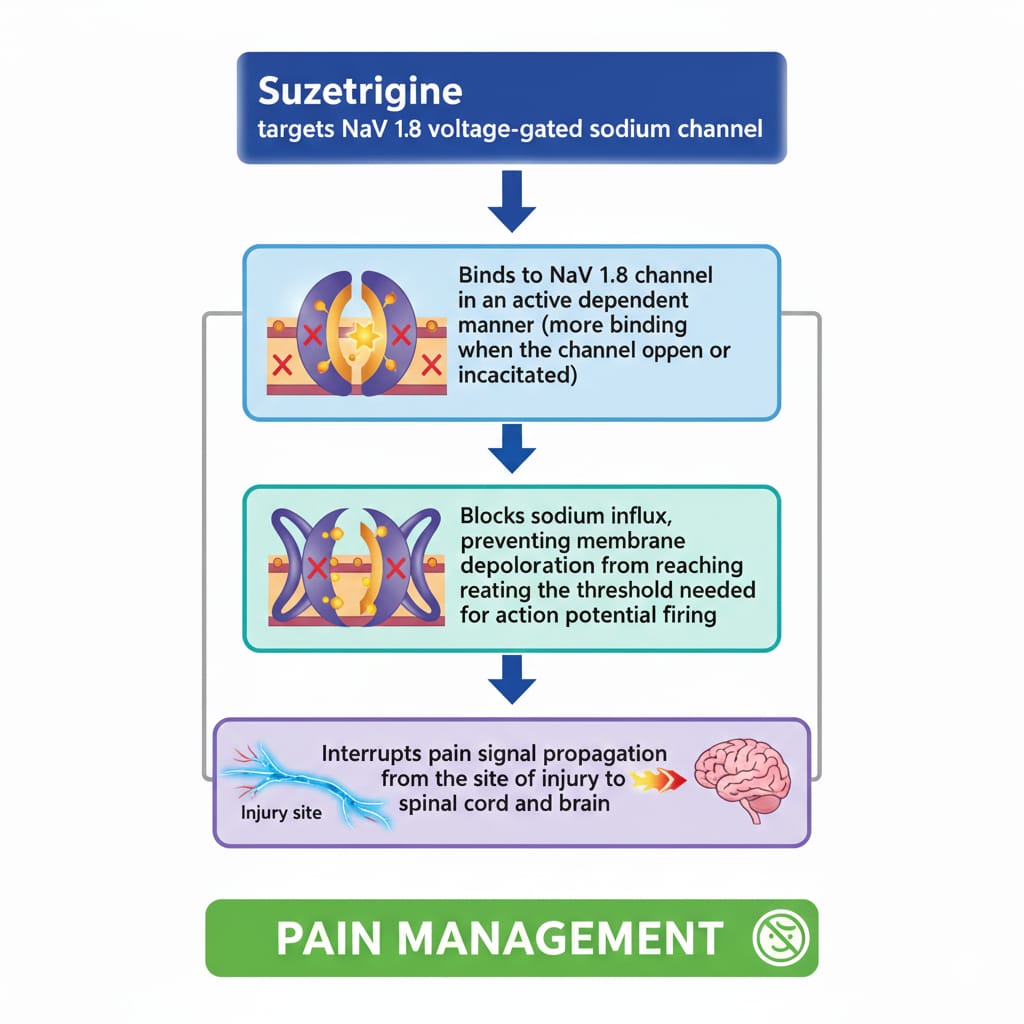 Suzetrigine is a recently developed kind of pain medication which can be administered orally. It does not fall under the NSAID or opioid drugs. Its mechanism of action involves having a selective inhibitory effect on a sodium channel known as Na V1.8, which is involved in the transmission of pain in the body. The characteristic of suzetrigine is that it is used to treat pain by targeting the pain signals in the body, but does not influence opioid receptors, which will lower the risks of getting addicted and the side effects on the brain and nerves will also be reduced. This renders suzetrigine a suitable choice in treating pain in the current medical practice [26,28,32].