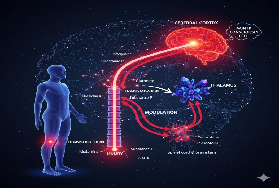 Pain perception occurs when nociceptive impulses reach higher brain regions and are interpreted as a conscious sensory experience [17,23]. These impulses are first integrated in the thalamus and subsequently analyzed in the somatosensory cortex to define the intensity and site of pain, while the limbic system mediates the associated emotional response [22,23]. Consequently, the experience of pain depends on coordinated processing within multiple central nervous system structures rather the solely on peripheral stimulation [17,22,23].