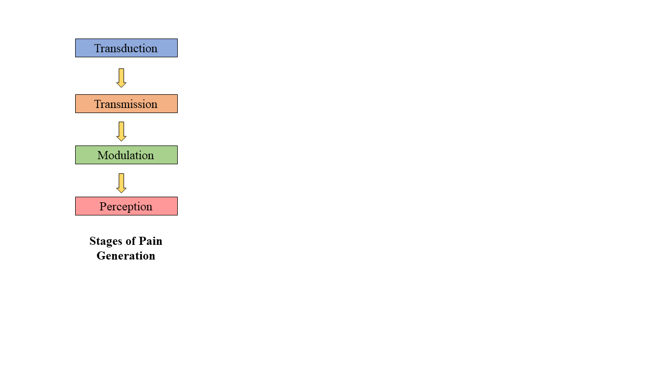 Pain generation is one of the complex physiological process, that can arise when noxious stimuli activate the specialised sensory receptors called nociceptors [17,18,19]. The pain generation pathway involves mainly four steps, there are