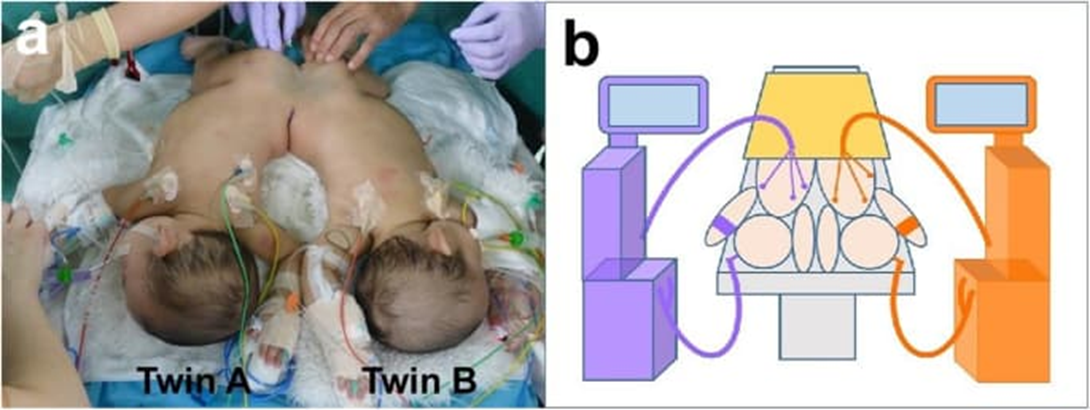 Several case reports illustrate the seriousness of this issue. In one instance, a neuromuscular blocking agent administered to one thoracopagus twin resulted in complete respiratory paralysis in the sibling due to extensive vascular shunting. [19] In another, sedative medication caused one twin to enter deep anaesthesia while the other displayed only mild sedation, making balanced induction nearly impossible. [20]
