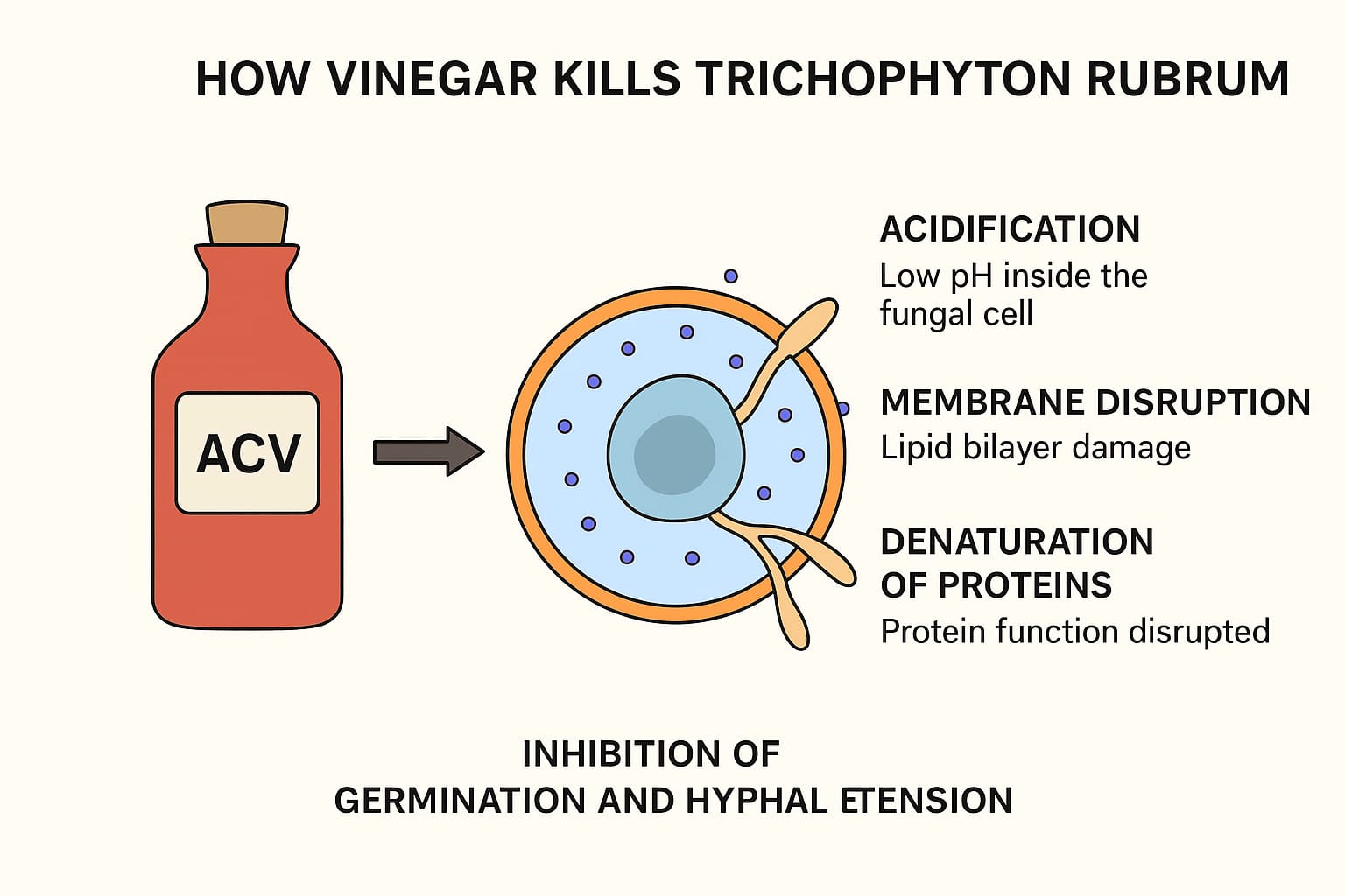 General disinfection assays support broad antifungal activity of vinegar: for example, standardized tests found 5% acetic acid eliminated >10^5 CFU of Candida albicans (a yeast) within 30 minutes.[30] In the Moroccan study of various apple vinegars, the sample with the highest acidity (~4%) showed “remarkable antimicrobial potency” against bacteria and yeast. Though that study did not include T. rubrum, it underscores that higher acetic acid content yields stronger fungicidal activity.[31] A veterinary dermatology study reported extremely low MICs of acetic acid against dermatophytes: for T. mentagrophytes (a species closely related to T. rubrum), the MIC of acetic acid was 0.28 μg/ml similar to terbinafine 0.295 μg/mL—and much lower than MICs of fluconazole or griseofulvin. (For Microsporum canis, acetic acid MIC≈1.05 μg/mL In that study, fluconazole and other azoles showed minimal activity against) dermatophytes, whereas acetic acid and terbinafine were most potent.[33] These data suggest acetic acid can inhibit dermatophytes in vitro at levels comparable to standard antifungals.[32] Clinically, data are limited. In a 2018 RCT on mild-to-moderate onychomycosis, daily application of a water-based acetic acid nail lacquer (peelable polish) was compared to weekly 5% amorolfine lacquer. After 180 days, both groups showed similar modest improvement: the mean healthy nail surface increased by 11.8% in the ACV group vs 13.2% in the amorolfine group.[34] “Improvement or success” (clinically judged) was 96.0% with daily ACV vs 79.6% with amorolfine.[35] thus, topical acetic acid performed comparably to a standard antifungal in this trial.[36] (This study likely included mostly T. rubrum and T. interdigitale, the usual onychomycosis pathogens, though culture data were not specified. No significant adverse events occurred in either group.[32] In contrast, no high-quality trials have tested ACV for T. rubrum tinea pedis (athlete’s foot). One health source notes there are “no studies” on vinegar foot soaks for tinea pedis.[34] Consequently, efficacy claims for ACV soaks derive mainly from theory and anecdote. Some practitioners propose nightly 1:1 vinegar–water soaks (giving ~2.5–5% acetic acid) to acidify the skin, but this is not evidence-based. As one review summarizes: home remedies like vinegar are “sometimes recommended” but “none…have been tested in good-quality studies. In short, in vitro data show acetic acid can inhibit dermatophytes at low pH, and one in vivo study (a nail trial) found acidification comparable to topical therapy. But we lack definitive clinical evidence for ACV against T. rubrum infections of skin or nails. Conventional antifungals target ergosterol or cell division specifically. Allylamines (terbinafine) and azoles (itraconazole, fluconazole) have known MICs against T. rubrum. In vitro, terbinafine MICs for dermatophytes are typically 0.01–0.1 μg/mL, while many T. rubrum isolates have fluconazole MICs in the 1–16 μg/mL range (often clinically resistant).[17] By comparison, the veterinary study above suggests acetic acid’s MIC (0.28 μg/mL) is in the same ballpark as terbinafine.[36] In that study T. mentagrophytes viability was “lowest” with acetic acid, followed closely by terbinafine. Fluconazole, however, had essentially no effect (MIC >>100 μg/mL) in those tests.[37] This implies ACV’s non-specific acidity can rival allylamine potency in vitro, whereas azoles show little activity. However, no trials have directly compared ACV to systemic antifungals in patients. The nail lacquer trial showed ACV ≈ topical amorolfine[38], but neither group was systemic. In practice, standard antifungals typically achieve higher cure rates; ACV’s benefit appears limited to acid pH rather than a targeted drug mechanism