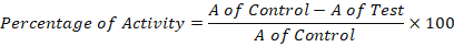 Percentage of Activity=A of Control-A of TestA of Control ×100