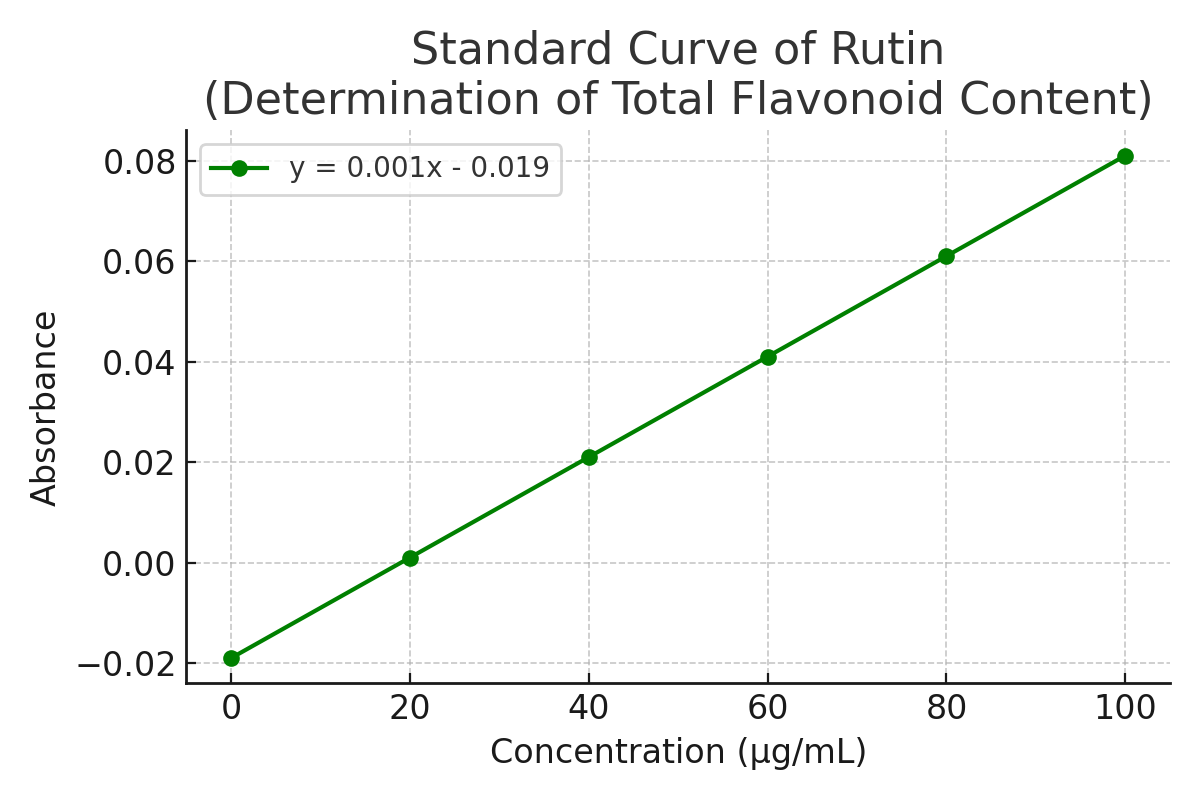 Total flavonoid content was determined using a colorimetric method described by Dewanto et al. A measured volume of the diluted plant extract or rutin standard solution was combined with 75 µL of sodium nitrite (NaNO?) solution. The mixture was allowed to react for 6 minutes before the addition of 0.15 mL of aluminum chloride (AlCl?) solution at a concentration of 100 g/L. After 5 minutes, 0.5 mL of sodium hydroxide (NaOH) was added to the mixture. The final volume was brought up to 2.5 mL using distilled water, and the contents were mixed thoroughly.? The absorbance of the resulting solution was measured at 510 nm using a spectrophotometer. A blank was prepared using the same reagents, but without the sample. The total flavonoid content was calculated using a rutin calibration curve and expressed as milligrams of rutin equivalent per gram of dry weight (mg rutin/g DW).? Each sample was analyzed in triplicate [14]. The concentration of flavonoids in the samples was estimated using the linear regression equation derived from the rutin standard curve:? y = 0.001x - 0.019, with a correlation coefficient of R² = 0.993, indicating strong linearity. The absorbance value (y) from the test sample was substituted into the regression equation to calculate the flavonoid concentration.?