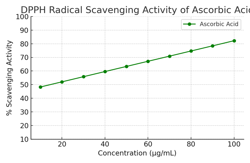 The antioxidant activity was evaluated using the 2, 2-diphenyl-1-picrylhydrazyl (DPPH) free radical assay. DPPH is a stable free radical that exhibits a deep violet color. When antioxidants are present, they donate hydrogen atoms to the DPPH radicals, reducing them to the non-radical form (DPPH-H), which leads to a decrease in absorbance. The extent of this color reduction reflects the ability of the antioxidant to scavenge free radicals.? To determine the scavenging activity, varying concentrations (5–20 mg/mL) of each sample were prepared in water and ethanol. Each sample solution was mixed with 1 mL of a 0.2 mM DPPH solution in ethanol. The mixture was shaken thoroughly and incubated in the dark for 30 minutes. After the reaction period, the absorbance was measured at 517 nm using a blank as the reference.?
