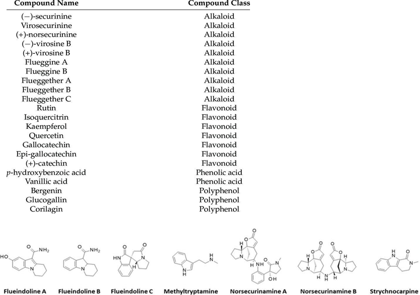 The network of chemical compounds of the plant revealed the same alkaloids, triterpenes, tannins, flavonoids and saponins, resins, steroids, cardiac glycosides and anthraquinones, 11- O-acetylbergenin, virosecurinine, entphyllanthidin, 11- O-acetyl borgenin, virosecurinine, and entphyllanthidine, kaempferol, quercitrin, tannic acid, daucosterin, and beta-sitosterol. Corridors of all plants contain indolizidine heavier alkaloids and their substantial isomers and derivatives of the highly poisonous securinine. The alkaloids are grouped into five major groups, surviving type alkaloids (virosecurinine, viroallosecur..