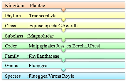 The whole plant can be considered an effective source of useful medicines for the treatment of colorful affections as indicated by the presence of alkaloids, steroids, saponins, cardiac glycosides, flavonoids, and numerous other secondary metabolites.[1] The phytochemicals in medicinal plants have been reported to be the active principles responsible for the pharmacological capabilities of plants.[14] Almost all of the composites insulated from the roots and leaves belong to alkaloids, glycosides, and terpenoids order which have a wide range of natural composites. The composites Flueggether A and Virosinin A, Viroseurinine, Flueggine B( alkaloids), Betulinic acid( Triterpene), Berginin( CGlycosides), Flueggrenes A and B( Trinorditerpens), enjoyingAnti-HIV, antiproliferative, cytotoxic, antiarrhythmic and Anti-Hepatitis C action which are veritably important in medicinal field. [2]The presence of these chemicals in the plant justifies the original uses of the plant for the treatment of various affections and suggests that traditional drugs still play an important part in meeting the introductory health care of original communities.[3] There are numerous other undisclosed operations of this plant, which remain uninvestigated and serve as the base for further studies.[7] This review will help the experimenters to know its different actions and give perceptivity for unborn exploration aimed at both ethnopharmacological confirmation of the popular use of plants and its disquisition as a new source of bioactive particles for herbal medicines and implicit operation in reciprocal and indispensable drugs.[10]