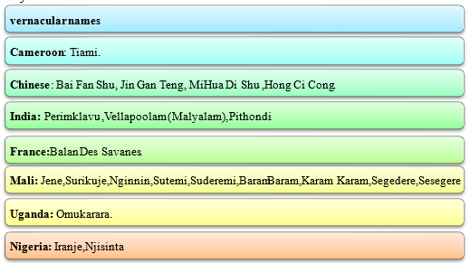 A splint decoction is taken to treat lactation diseases and is also given to nursing maters whose babies are sickly at birth or to women with the threat of stillborn babies. The decoction of the leaves and roots is used for abdominal pain in Tanzania while the splint decoction is drunk for fever. The decoction of the splint with some other shops is used in northern Nigeria for the treatment of internal illness and painful lumps. Leaf grease paint is taken for revocation. Leaves retain anti-diabetic activity new leaves and roots are for coughs and malaria.[3] The leaves are used in the treatment of bellyache, rheumatism, diarrhea, epilepsy, diabetes, body pain, and ever.
