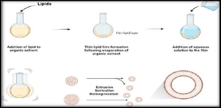 Thin hydration method the typical thin-film hydration technique for making phytosomes entails dissolving bioactive substances and phospholipids in an organic solvent, such as methanol or chloroform. A thin film is created following solvent evaporation, and when it is hydrated with an aqueous phase, stable, nanoscale vesicles with improved bioavailability are produced. The thin-film hydration method was used to synthesize the enhanced pomegranate peel extract into nano-phytosomes, which had a one-year stability and a 58% encapsulation efficiency with a particle size of 154.0–216.5 nm. Resin column chromatography, which was previously optimized at a 3:1 resin-to-extract ratio, improved bioavailability and functioning by increasing phenolic content 2.63 times with an 80.50% yield(17).
