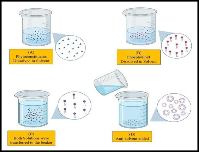 In order to prepare phytosomes using the antisolvent evaporation approach, bioactive substances and phospholipids must be dissolved in an appropriate organic solvent, such as methanol, ethanol, or chloroform. In order to create a stable phytosomal complex, an antisolvent—usually water or a hydroalcoholic solution—is then progressively added to cause precipitation. After that, the organic solvent is removed, guaranteeing the phytosomes' better stability and appropriate encapsulation. The bioavailability and therapeutic effectiveness of poorly soluble bioactive chemicals are improved by this technique. Utilizing the antisolvent precipitation method, Murraya koenigii phytosomes created to improve their antidiabetic qualities. When administered to diabetic Wistar rats, the optimized formulation (236 nm, 75.1% entrapment) dramatically decreased serum glucose levels, indicating better therapeutic efficacy than the crude extract.(16)