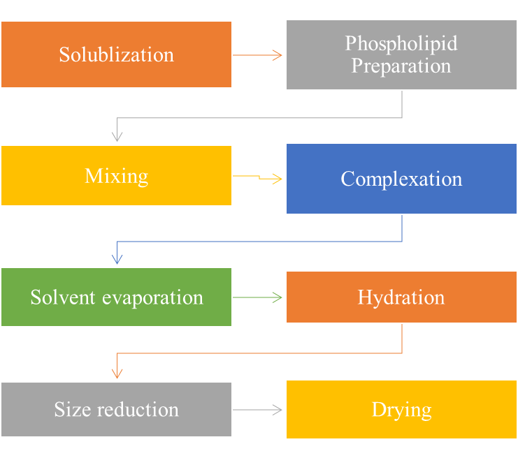 The solvent evaporation approach for phytosomes production entails dissolving phospholipids and bioactive chemicals in an organic solvent such as chloroform or ethanol. The mixture is then subjected to rotary evaporation at low pressure to remove the solvent, resulting in the development of a thin lipid layer. This film is hydrated with an aqueous phase, then sonicated or homogenized to produce homogenous phytosomes. Utilizing the solvent evaporation method to increase bioavailability, silymarin-containing phytosomes demonstrated stability, a 133.53 nm vesicle size, and an entrapment efficiency of 97.17%. Spectroscopy and microscopy verified the successful formation of the complex and the integrity of the vesicles.(15)
