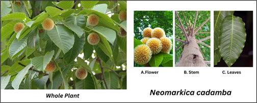 In Ayurveda, kadamba bark and leaves treat fever, diarrhea, inflammation, and skin disorders, while indigenous tribes remedy urinary issues and dysentery. Southeast Asia uses it for diabetes and wound healing. Hinduism reveres it as sacred to Lord Krishna, celebrated during Kadambotsava festivals. [8]Neolamarckia cadamba boasts a rich phytochemical profile featuring indole alkaloids like cadambine, dihydrocadambine, isodihydrocadambine, neolamarckines A-E, cadamine, and 3β-isodihydrocadambine, predominantly from leaves and bark. Triterpenoids such as quinovic acid glycosides, cadambagenic acid, and betulinic acid, together with flavonoids (quercetin-3-rhamnoglucoside, kaempferol), phenolics (caffeic acid, chlorogenic acid), tannins, saponins, and steroids including β-sitosterol, underpin its bioactivity. [9,10]