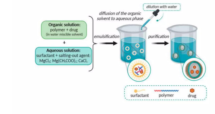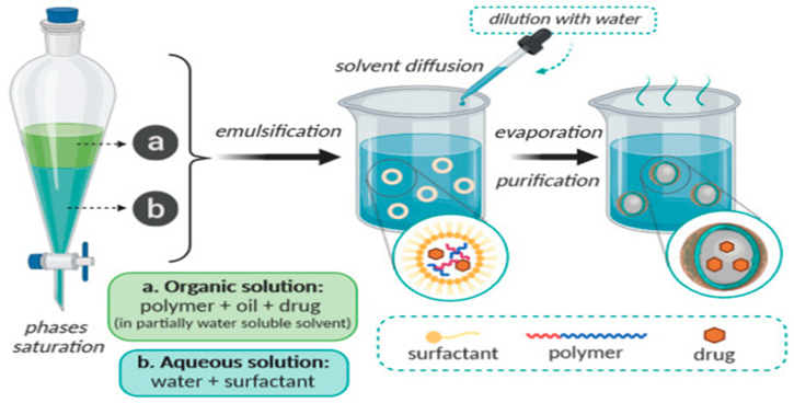 First proposed by Leroux et al. The organic phase is generated by dissolving polymer in organic solvent and then saturated with water as it helps for polymer precipitation and improves its diffusion. The organic solvent is emulsified into aqueous phase containing stabilizer leads to solvent diffusion and nanoparticles production. The solvent is eliminated by distillation or crossflow filtration.