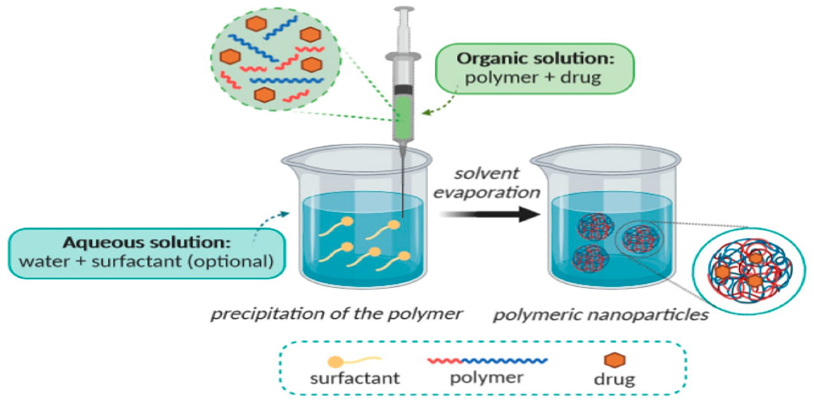 During nanoprecipitation organic phase is introduced into the aqueous phase. For this the organic phase is prepared by dissolving the polymer and the hydrophobic drug in the water miscible organic solvent that has diffusion effect. The aqueous phase contain a stabilizer like surfactant ,the polymer must be insoluble in aqueous phase to slow aggregation process. To produce polymeric nanoparticles, organic phase is added to the aqueous phase drop wisely with moderate stirring. formed nanoparticles are ultracentrifuged and washed with water to remove surfactant ,as the organic solvent evaporates leaves the hardened nanoparticles which are collected by filtering, spinning and freeze-drying.