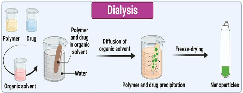Dialysis is a fast and easy method to prepare small, narrowly distributed polymeric nanoparticles [36]. The polymer solution is prepared by dissolving polymer in a organic solvent is placed inside a dialysis membrane with an appropriate molecular weight cut-off. The system is dialysed against a non-solvent, it leads to gradual replacement of the organic solvent across dialysis membrane. The polymer looses its solubility as the solvent diffuses out and start aggregation results in the generation of nanoparticles. Various studies have reported the synthesis of polymeric and copolymeric nanoparticles by using this method. The solvent selection for polymer dissolution influence the particle size distribution and morphology. Chronopoulou et al.(2009) introduce a novel osmosis based method for the preparation of natural and synthetic polymeric nanoparticles. In this method a physiological barrier, such as dialysis membrane or conventional semipermeable membrane is used that allows the passive transport of solvent and there by slow the mixing of the polymer solution with a non-solvent [37]