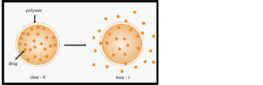 Diffusion controlled drug delivery systems are classified into two types: reservoir systems (or core-shell systems) and matrix systems (one-block or monolithic systems). In reservoir systems, there are three phases, water diffusion, drug dissolution and drug diffusion, that occur in a sequence with an initial phase (Figure 1.2). The drug diffusion phase is the rate-limiting step as in the case of drug reservoir systems. As this kind of system does not have polymer barriers or boundaries, it shows a high initial drug release rate, followed by a low release rate with the function of the time because of the increasing distance for the accessible drug to diffuse to the surface. It results in dependency of the release rate on the shape and geometry of the drug vehicle [8].
