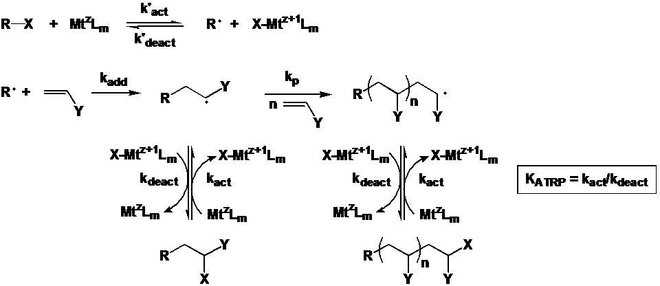 The catalysts are generally transition metal complexes with Cu, Fe, Ru, Ni, or Os using alkyl halides as initiators (R-X). In ATRP, the concept involves the activation of dormant species by the transition metal complexes and the subsequent generation of radicals from such species via an electron-transfer process. The metal is then oxidized to a higher oxidation state. The equilibrium is formed extremely fast in this reversible system, thus favoring the transfer of free radicals to the side with a much less concentration of free radicals. The number of chains will thus depend on the amount of initiator. During the propagation of the growing chains, the active or dormant formation probability is the same for both the chains or the monomers. This gives a method of preparing polymers with similar molecular weights and narrow molecular weight distributions. It's worth noting that ATRP has quite some advantages in being very stable, tolerating many functional groups in the monomer or initiator, including allyl, amino, epoxide, hydroxyl, and vinyl [17]. The following diagrams will show chemical equations for some basic ATRP reactions as shown in (Figure 19).