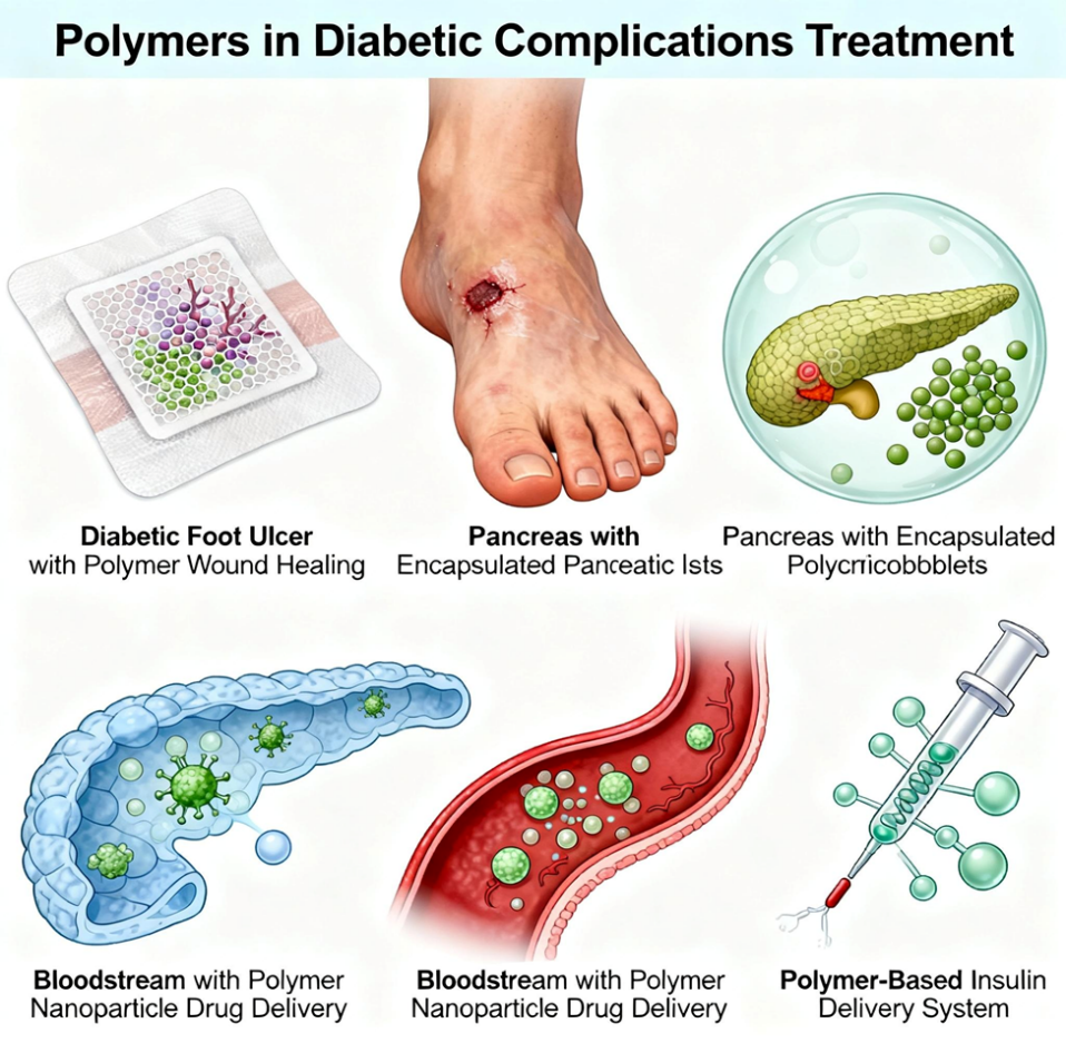 Polymers have become vital tools in managing diabetic complications, especially diabetic wounds, by providing advanced biomaterials that enhance healing and drug delivery. Natural polymers like chitosan, alginate, and hyaluronic acid, and synthetic polymers such as PLGA, PEG, and PVA, are engineered into hydrogels, nanoparticles, and scaffolds to improve antimicrobial activity, reduce inflammation, combat oxidative stress, and promote tissue regeneration. These polymeric systems enable controlled and sustained release of therapeutic agents, targeted delivery to affected tissues, and protection of transplanted cells for insulin regulation. Despite their potential, challenges remain in biocompatibility, immune responses, and scalability. The future focus lies in developing smart, multifunctional, and personalized polymer platforms integrated with bioactive molecules to revolutionize diabetic care and improve patient outcomes.