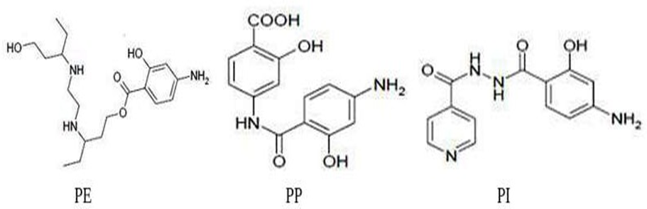 iv. Anti-Tubercular Agents: - Ethambutol (EB), isoniazid (INH) and p-amino salicylic acid (PAS) are potent antitubercular agents having various side effects due to formation of toxic metabolites. Mutual prodrugs of EB with PAS (PE), PAS with PAS (PP) and INH with PAS (PI) were synthesized and characterized. In vitro hydrolysis studies in SGF and SIF reveal that these mutual prodrug conjugates do not hydrolyse appreciably and are absorbed unhydrolyzed. In vivo studies showed greater serum concentrations of EB, PAS and INH than their concentrations when given alone and isoniazid concentrations were greater except for PP. Mutual prodrugs PI and PE significantly eliminate the problem of fast metabolism, toxicity and local irritation and reduction of therapeutic doses.