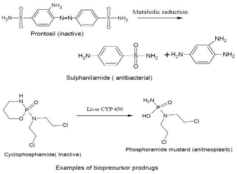 This approach does not include any carrier molecule. In this an inactive drug undergoing chemical modification to convert into a compound which itself is active drug or further metabolized into active form which have a desired therapeutic efficacy.The chemical reaction occurs in this process include oxidation or reduction. (e.g. amine to aldehyde to carboxylic acid).
