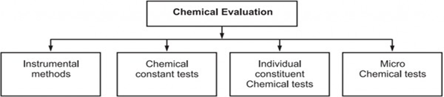 Chemical assays, quantitative and qualitative chemical testing, and instrumental analysis are all included in the chemical evaluation. Chemical methods of evaluation include the separation, purification, and identification of active ingredients. Identification tests for different phytoconstituents, such as alkaloids, glycosides, tannins, etc., are included in qualitative chemical testing.