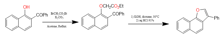 Other method of synthesis of naphthofuran derivatives by base-catalyzed cyclization reaction of the corresponding o-alkoxybenzoylarene derivatives. The o-alkoxybenzoylarenesis obtained from the etherification reaction of the o-hydroxybenzoylarenes, which is prepare either by the reaction of methoxyarenes with benzoyl chloride in the presence of aluminum chloride or by photo-Fries rearrangement of aryl benzoates.[8]