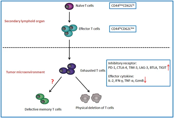 Fig:03 T-cell exhaustion and differentiation in TME. Naive T cells (CD44lowCD62Lhi) activate and differentiate into effector T cells (CD44hiCD62Llow) in secondary lymphoid organ. When effector T cells enter TME, they are polarized into exhausted T cells, with decrease in effector cytokines (IL-2/IFN-γ/TNF-α/GzmB) and increase in inhibitory receptors (PD-1/CTLA-4/TIM-3/LAG-3//BTLA/TIGIT). Subsequently exhausted T cells may turn to be defective memory T cells or be deleted physically