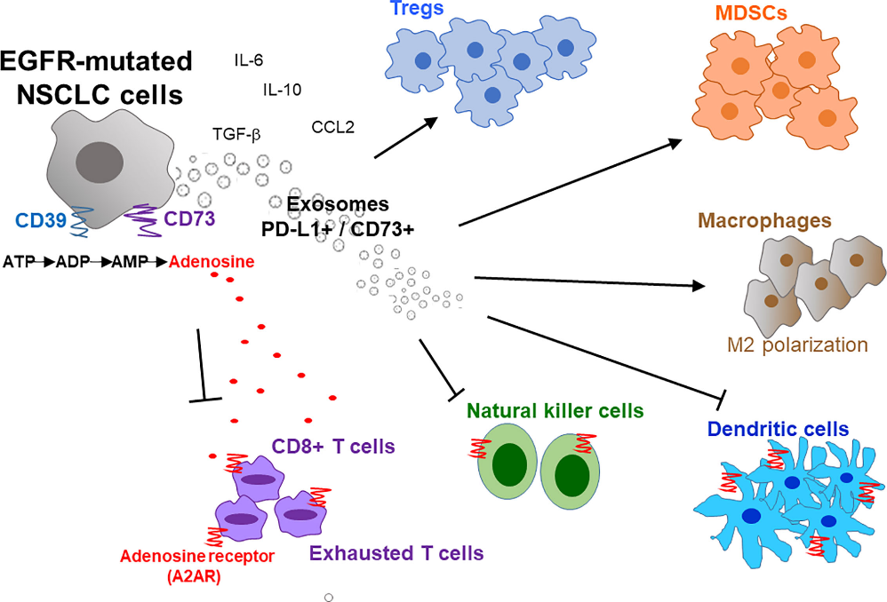 Fig: 04 The tumor microenvironment (TME) associated with epidermal growth factor receptor (EGFR)-mutated non-small cell lung cancer (NSCLC) exhibits immunosuppressive characteristics. This immunosuppression is facilitated by EGFR mutations interfering with various intracellular signalling pathways and modulating the function of accessory immune cells within the tumor, including lymphocytes, natural killer cells, regulatory T-cells, myeloid-derived suppressor cells, and tumour-associated macrophages.[34]