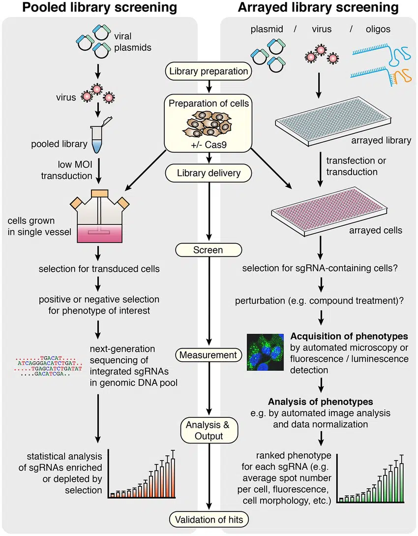 Fig 2: CRISPR/Cas9-based screen general workflow in pooled versus arrayed strategies. 2015 Agrotis and Ketteler [5], licensed under CC BY 4.0. MOI, multiplicity of infection; sgRNA, single guide RNA.