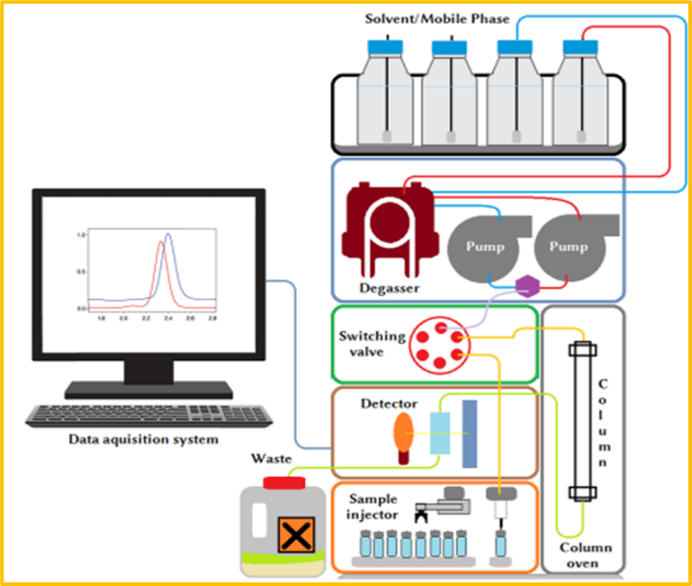 The solvent system components are contained in a glass bottle. In HPLC, the mobile phase, sometimes referred to as the solvent, is made up of a polar and non-polar liquid ingredient together. Different polar and non-polar solvents will be utilized, depending on the characteristics of the sample. Pump: Prior to transferring it to the detector, the pump forces the mobile phase out of the solvent reservoir and into the column. 42000 KPa is the pump's operating pressure.