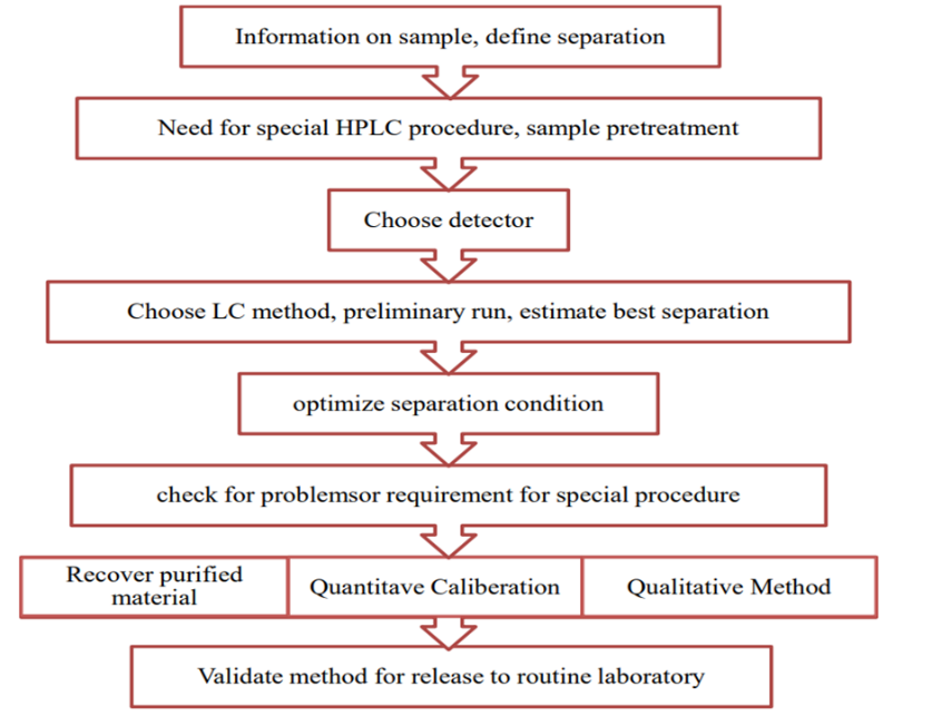 Selection of detector: The detector was chosen based on the analyte's UV absorbance, fluorescence, conductance, oxidation, reduction, etc.