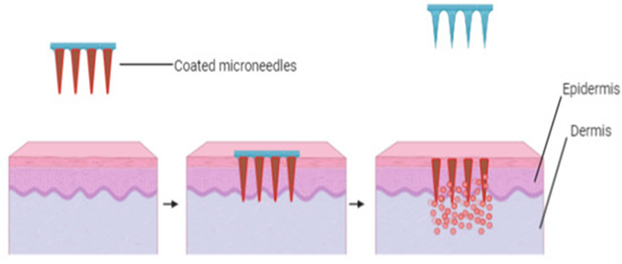 The skin is a suitable site for the delivery of genes and oligonucleotides because it is well-characterized at both the molecular and cellular levels²?. Microneedle (MN) systems have been explored for the treatment of various genetic disorders, skin-related malignancies, infectious diseases, and for immunization purposes. Compared to conventional microinjection techniques, MN-mediated gene delivery offers the advantage of treating multiple cells simultaneously. The effectiveness of a transdermal delivery system depends largely on the ability of a drug molecule to penetrate the skin barrier. Large molecules, such as peptides and vaccines, have traditionally posed manufacturing and delivery challenges due to their high molecular weight²¹. MNs have demonstrated the capability to deliver such macromolecules intradermally and, in some instances, at lower doses than traditional injection methods, while achieving equivalent or improved clinical outcomes²². For example, similar hemagglutinin inhibition antibody levels were achieved with less than half the usual vaccine dose when delivered using MNs compared to conventional intramuscular injections. The efficacy of MN-based vaccination has been recognized by regulatory bodies, including approval for seasonal influenza vaccines. Moreover, MN systems have shown superior thermal stability maintaining up to 90% immunological potency after four months of storage at 40 °C²³.
