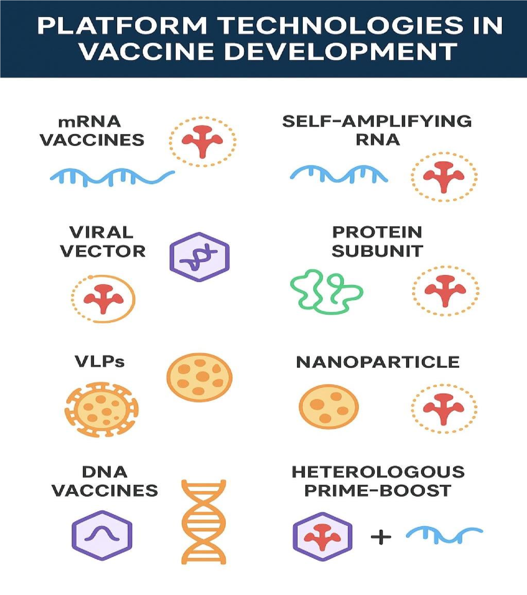 7) Heterologous Prime-Boost and Combination Platforms : An emerging strategy is to combine multiple platforms to optimize immune responses. For example:mRNA prime + protein boost for durable immunity.Viral vector prime + RNA boost to broaden cellular and humoral responses. Multi-antigen and multi-platform formulations for universal coverage.[11]